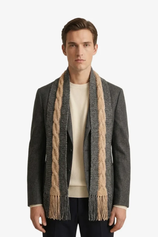 Diseño Destacado: Presenta una base en gris cenizo con una prominente trenza central en tono crema, tejida con precisión para resaltar la textura del punto.